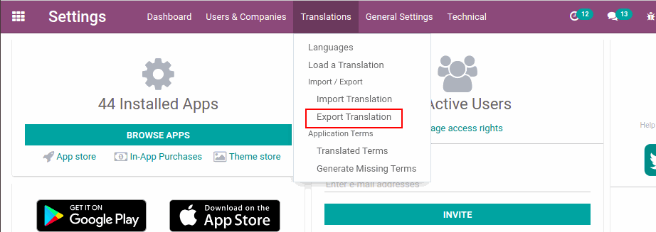 Select Settings > Translations > Import / Export > Export Translation