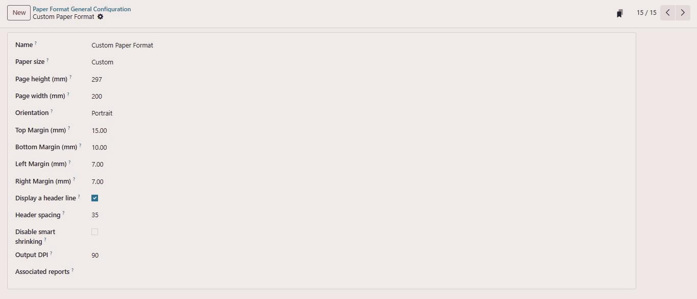 <field name="header_line" eval="False"/>By using header space we can increase or decrease space between header and page.<field name="header_spacing">3</field>The default dpi used in Odoo is 90, we can change it as per our needs.<field name="dpi">90</field>After creating the paper format we can see it in the Paper Format menu under the Reporting menu of Technical Settings.